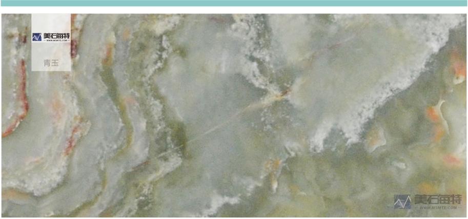 青绿底色,杂乱褐线纹,温润,透光。