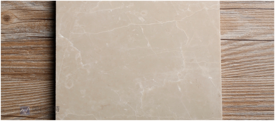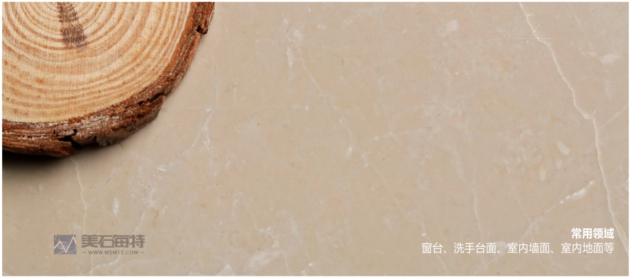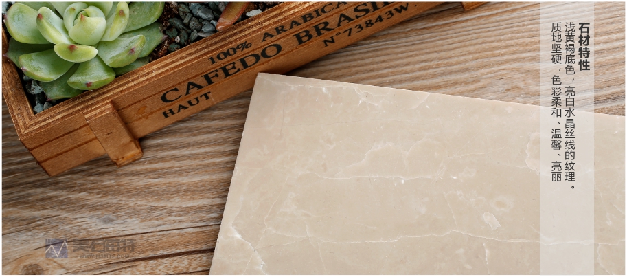浅黄褐底色,亮白水晶丝线的纹理;质地坚硬,色彩柔和、温馨、亮丽